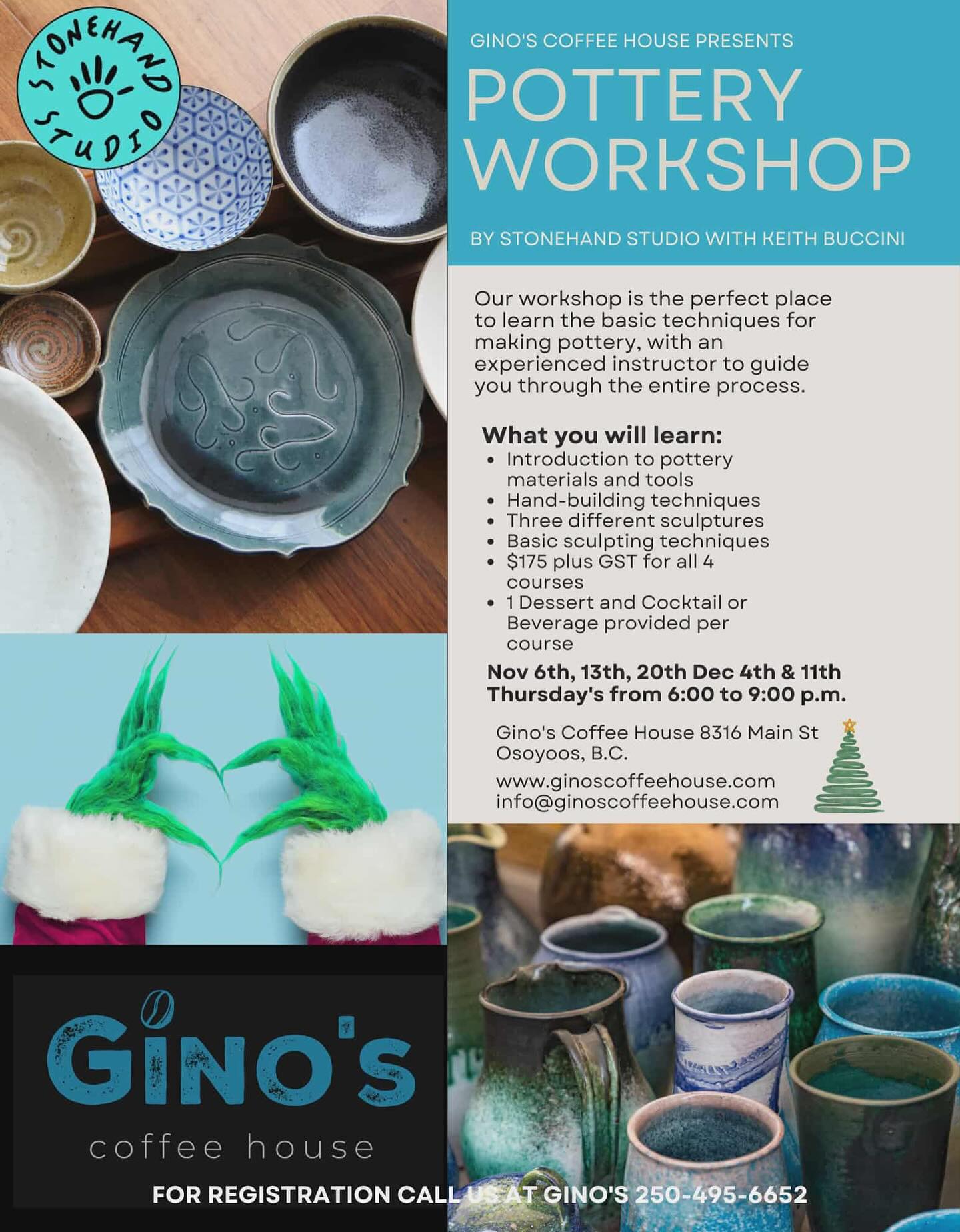 Pottery Classes at Gino’s Coffee House in November. “Unleash Your Creativity at Gino’s Pottery Workshop #3!” Learn the fundamentals of pottery making in a fun and […]